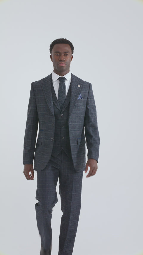 - Tvídově modrý kostkovaný oblek Prince of Wales Navy z prvotřídní měkké tkaniny Wool Feel s vestou s odkládacím límcem