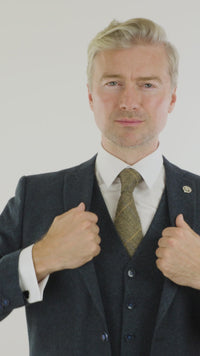 * Klasický tvídový oblek s motivem rybí kosti z 20. let 20. století, střih na míru (mezi úzkým a běžným střihem)