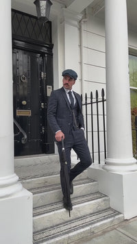 * TROJDÍLNÝ OBLEK: Pánský třídílný oblek se skládá ze saka, kalhot a vesty. Sako je jednořadé se zapínáním na 2 knoflíky, 2 předními klopami se semišovými lemy; jednou náprsní kapsou, 3 vnitřními kapsami, klopou se zářezem a 1 středovým rozparkem. Vesta se zužuje v pase; má 2 nazouvací kapsy, 1 kapsu na hodinky, klopu se zářezem, stříbrný řetízek s přívěskem a nastavitelnou přezku. Kalhoty budou o 6″ menší než vámi zvolená velikost saka, zúžené, se zapínáním na knoflíky a zip, 2 bočními kapsami a 2 zadními kapsami.