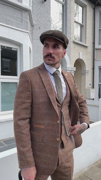 Pánský třídílný oblek z vlněného tvídu, vzor rybí kosti, hnědý, modrý, kostkovaný, Gatsby z 20. let